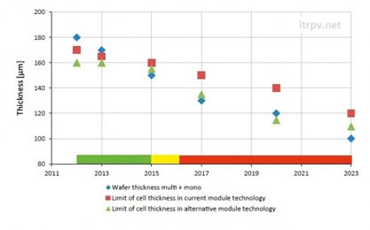 然而ITRPV指出,2020年,预计在大批量生产的太阳能电池中的原切割硅片的厚度及在组件制造中最小的电池厚度可低于120微米。