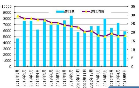 索比光伏网讯:据最新海关统计数据显示,2013 年 5 月我国多晶硅进口量为 5859 吨,环比下滑 19.35%,同比大幅下降 25.8%,为 2013 年以来进口量的最低 值;同时,5月份我国多晶硅进口均价微幅增长至18.24美元/千克,环比增长1.3%, 同比下滑 32.9%。硅业分会认为,直接导致 5 月份进口多晶硅量大幅下滑的主要 原因是业内预期国内多晶硅“双反”案件在 6 月份初裁,并推动进口价格略有回 升。