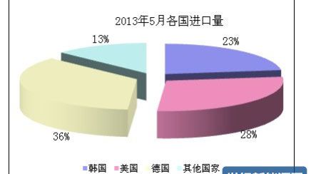 据 5 月份分国别进口数据显示,自韩国、美国、德国进口量占总进口量的 87%,这三国仍为出口多晶硅最多的国家。其中从韩国进口量为 1342 吨,占总 进口量的 22.9%;从美国进口量为 1661 吨,占总进口量的 28.3%;德国进口量为 2097 吨,占总进口量的 35.8%;其他地区进口量为 760 吨,仅占总量的 13%。 其中 5 月份自美国和韩国进口多晶硅量均有不同程度下滑,而自德国进口量则出 现小幅增长,致使 5 月份自德国进口多晶硅量位居分国别进口量榜首。2013 年 1-5 月累计从韩国、美国、德国进口量为 29708 吨,占累计进口总量的 86.5%, 其中从韩国累计进口 8150 吨,从德国累计进口 10062 吨,从美国累计进口 11496 吨。