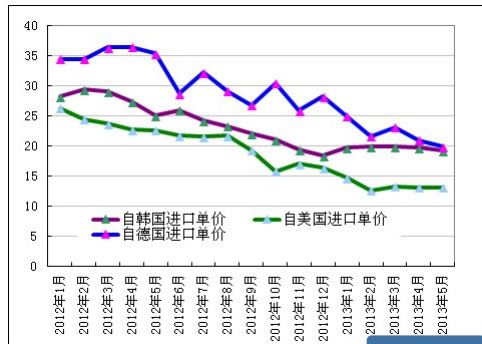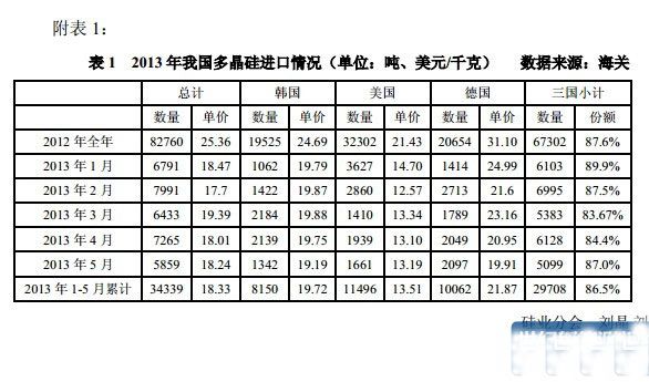 从 2013 年 5 月份三大多晶硅出口国出口单价来看:韩国 19.19 美元/千克、 美国 13.19 美元/千克、德国 19.91 美元/千克。2013 年 5 月份除自美国进口单价 较 2013 年 4 月微幅回升 0.7%外,韩国和德国的进口单价均延续 2013 年 4 月份 跌势,较 2013 年 4 月份出现不同程度地下滑,其中自美国进口多晶硅单价在 2013 年 5 月依旧为三国之中最低位,而德国月均价又创历史新低。2013 年 1-5 月多晶 硅进口均价为 18.33 美元/千克,其中 1-5 月从韩国进口均价为 19.72 美元/千克, 1-5 月从德国进口均价为 21.87 美元/千克,1-5 月从美国进口均价为 13.51 美元/ 千克。