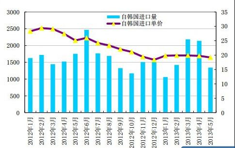 2013 年 5 月份从韩国进口多晶硅量大幅下滑至 1342 吨,环比下降 37.3%; 进口单价延续 4 月份跌势微幅下滑至 19.19 美元/千克,环比跌幅为 2.8%。 2013年1-5月累计从韩国进口多晶硅量为8150吨,均价为19.72美元/千克, 1-5 月进口价格相对持稳。
