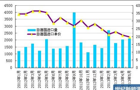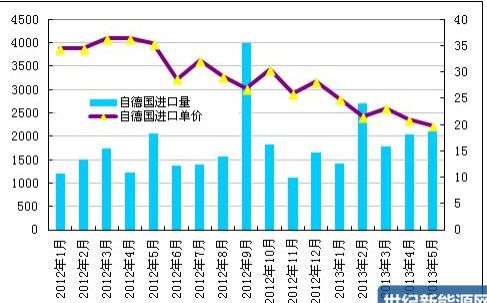 2013 年 5 月份从德国进口多晶硅量小幅增至 2097 吨,增幅为 2.3%;5 月进 口单价继续下滑至 19.91 美元/千克,环比跌幅为 5.0%,创2012 年以来历史新低。 2013年1-5月累计从德国进口多晶硅量为10062吨,均价为21.87美元/千克。