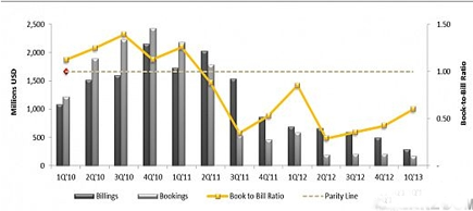 2013年第一季度全球光伏制造设备订单与出货量仍然低于预期,这已经是连续第八个季度低于预期。2013年订单出货量比为0.60,远远低于平均水平。