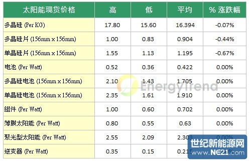 根据EnergyTrend的数据显示,多晶硅产品现货平均价格在今年三月达到高点后随即开始走软。据统计,在十二月至三月份,多晶硅的价格全面上扬,但上涨力道依不同地区而定。在大陆地区,由于受到双反议题的影响,相关业者加速出货,带动多晶硅的强劲需求,使得每月涨幅维持在3.5%至4.5%之间;反观在其它地区,市场反应较为缓和,因此仅二,三月涨幅维持在4%左右。而从四月起,价格下滑幅度开始加速,四月的平均跌幅为1.2%至1.3%,而五月则在5%至6%之间。在硅晶圆方面,产品价格至四月止仍维持上涨的局面,但五月份出现不同的发展方向。在单晶硅晶圆方面,五月的平均跌幅在0.2%至1.5%之间,主要原因在于单晶需求与高效多晶需求呈现负相关,根据EnergyTrend的观察,五月起高效产品的需求由单晶转向多晶,因此造成单晶硅晶圆的需求动能减缓,价格因此出现下滑。反观在多晶硅晶圆部分,自十二月起至五月为止,市场价格仍是维持上涨的局面,但涨幅自四月起呈现走软的局面。而根据EnergyTrend的研究,目前市场价格隐约出现分歧的走势,即高效产品的价格仍维持高档,但一般品的价格出现下滑的状况,因此一般品(Normal grade)的价格走势将牵动产品价格的未来展望。