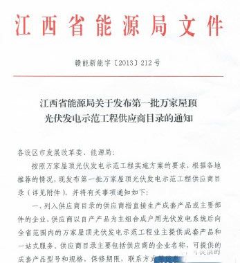 索比光伏网讯:记者获悉,2013年7月2日江西省能源局发布《第一批万家屋顶光伏发电示范工程供应商目录的通知》,根据通知要求列入供应商目录的供应商以自产产品为主,并可提供成套产品型号和规格、保修期限,联系方式等。企业作为供货商可在江西省各地设立代理商,并能提供一站式服务能力,代理商由各市发改委(能源局)发布。同时,由于代理商质量不高企业要及时取消更换。