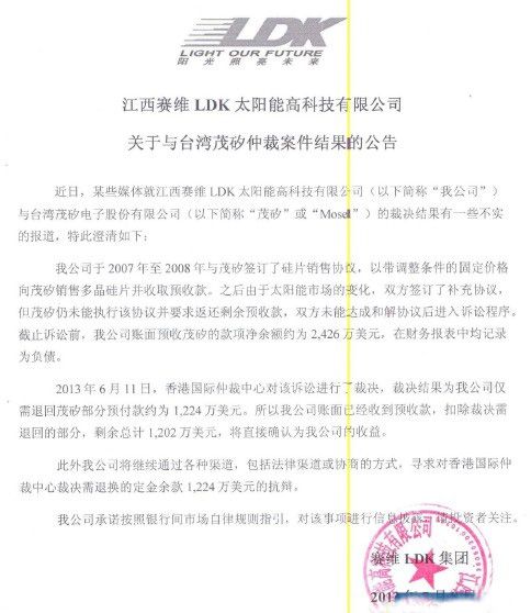 LDK表示,2007年至2008年与茂硅签订硅片销售协议,以带调整条件的固定价格向茂硅销售多晶硅产品并收取预收款。之后太阳能市场变化,双反签订补充协议,但茂硅仍未能执行该协议并要求返还剩余预收款,双方未能达成和解而进入诉讼程序,截止诉讼前,LDK账面剩余茂硅预付款2426万美元,香港仲裁中心裁定LDK退还茂硅1224万美元,扣除退还部分LDK剩余1202万美元,将确认为LDK收益。此外,LDK将继续通过法律途径要求裁定无需退还茂硅1224万美元。