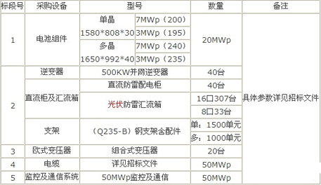 索比光伏网讯:本期共发布26条重点项目,其中中标项目3条,招标项目22条,支架采购信息1条。本期重点项目为:陕西光伏产业有限公司定边50MWp并网光伏电站工程设备采购项目,该公司主要采购:20MW光伏组件,20MW逆变器等产品。