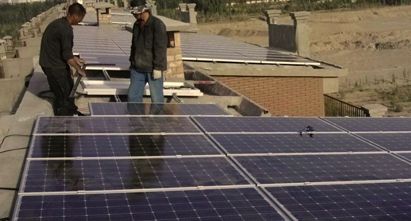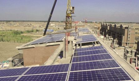 索比光伏网讯:记者新彊库尔勒现场报导:在位于新疆库尔勒市经济技术开发区迎宾路与拥军路、拥军北路交汇处,新疆华源实业(集团)有限公司开发的华源-圣地欣城康居示范工程小区工地上,人们看到了与常规层顶完全不一样的屋顶,当记者深入现场了解,才知道该康居示范小区屋顶采用了光伏发电屋顶这一新技术,为绿色建设节能增加了正能量,该华源-圣地欣城屋顶光伏发电系统(459KWp)建设项目工程是由山东烟台鼎城新能源光伏工程有限公司设计并承担施工。