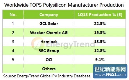 EnergyTrend表示,至2013年第二季为止全球多晶硅产能约在39万吨,其中前五大业者占比就高达57.6%,而前十名的占比则高到71.6%;另一方面,根据EnergyTrend的统计,2013年上半年累计出货量为8万吨左右,其中前五大业者的市占率超过七成,而前十大的市占率则高达八成以上,显见在全球多晶硅产业中,不论从产能与产出来看,排名十名以后的业者在经营上面临强大的挑战。