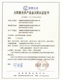 金太阳认证是中国可再生能源领域内最权威的认证品牌,由中国质量认证中心(CQC)与鉴衡认证中心(CGC)发证。认证产品只有通过CGC与CQC安全性能测试和EMC测试,同时公司管理水平需满足CGC与CQC工厂审核要求,方可以获得产品的金太阳认证证书。