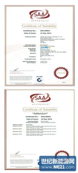 索比光伏网讯:近期,记者从江苏宝丰新能源公司研发中心了解到,该公司生产的MEGA SOLAR系列光伏并网逆变器一次性顺利通过由国际著名认证机构BV认证,如德国、西班牙、比利时、瑞典、英国和澳大利亚等十八个国家的光伏并网认证证书。