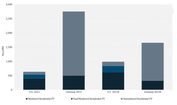 GTM研究认为,2013年,美国住宅光伏市场将达到770MW,德国则将收缩至1.6GW,而监控附着率预计不会有显著变化。这样,美国住宅光伏监控市场预计将达到600MW(将双重监控计算在内,将达到800MW),并成为世界上最大的住宅监控软件市场。