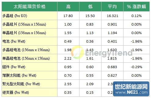 就现货市场整体表现来看,大陆与台湾市场上下游已经接受价格调涨,本周多晶硅价格持续上扬,平均价格来到$16.321USD/kg,涨幅0.12%;另外在中国内需价格上,价格区间仍在$130RMB/kg至$140RMB/kg之间。在硅片市场方面,未来价格出现想象空间,卖方目前对于价格不愿松手,本周价格维持平盘。在电池部分,台湾业者报价松动,价格出现下滑,价位来到$0.401/watt,跌幅1.96%;在组件方面,由于大陆二、三业者持续出清库存,本周平均价格来到$0.683USD/watt,跌幅0.29%。