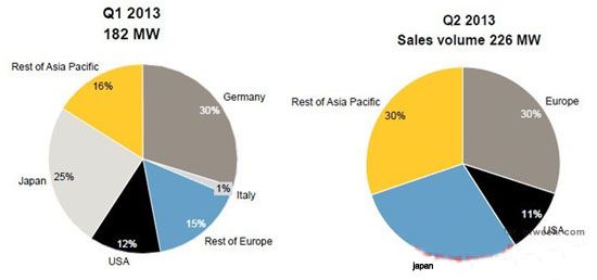 太阳能电池板产量上升,与第一季相比增长17%,销量由第一季的182MW增长到第二季的226MW,增长24%,同时价格也上涨6%。从出货地区看,对亚洲的出货量由第一季度的41%增长到59%,对欧洲的出货量由第一季度的46%下降到30%,对美国的出货量基本维持不变。RECGroup作为欧洲企业,加上组件制造基地在新加波,没有遭受本次欧洲对中国“双反”的影响,对欧洲的出货量反倒比第一季度下降38%,是欧洲市场衰落的有利证明。