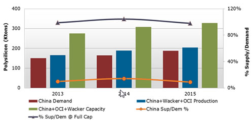 如图1所示,中国国内制造商预期产量,加上瓦克和OCI的产量将足以满足中国本土多晶硅需求。此外,如果将需求量和可用总产能加以对比,我们会发现后者还有大量盈余。这表明即使需求量大大超过预期,仅仅通过提高工厂利用率,多晶硅制造商就能够弥补差额。