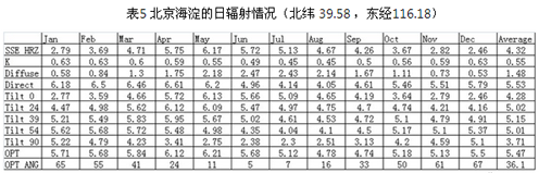 通过NASA提供的的北京海淀的日辐射情况显示,日平均满值小时数,水平面上是4.32小时,以向南34.9度倾斜是5.47小时。考虑系统损耗下的多年发电小时数约为1300-1600小时。