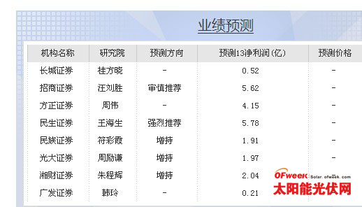 截止目前,6个月内共有8家机构对海润光伏的2013年度业绩作出预测;预测2013年净利润2.77亿元,较去年同比增长33.21%。其中1家机构“审慎推荐”,1家机构“强烈推荐”,3家机构“增持”。