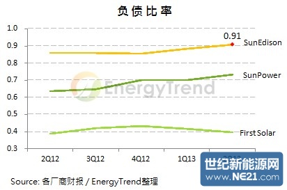 虽然SunEdison管理层对未来状况表示乐观,但从财报看来,节节攀升的负债比率应是公司目前首重的问题。原先该公司的负债比率就较一般欧美公司高,2Q12为0.85,近期逐渐攀升至2Q13的0.91。尤其电站建案初期需有较大笔的资金投入,且今年市况转佳,亏损状况却不见收敛,需特别留意资金周转状况。所幸流动比率虽达到近年最低,仍维持在1以上的水平,短期内不至出现财务危机。