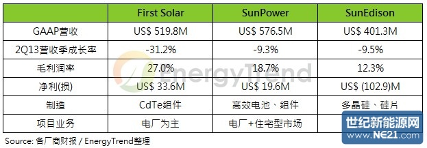 上半年太阳能整体供应链的价格皆有好转,但SunEdison因2012市场冷清,公司并无积极布局太阳能领域,导致过去几季太阳能营收一路下滑,电站安装量成长幅度也不及竞争对手;又因为在第二季系统售出少,财报表现较上季或去年同期差。SunEdison在电话会议中表示,待建造的电站数量将逐渐增多、并于年底大幅成长,故乐观看待未来状况,预期2014年财报表现能大幅改善。