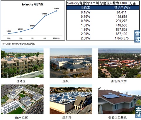Solarcity的用户包括了住宅区、工业区、大学与政府建筑、办公楼、商业中心、军区等。其签约用户数从2009年末的5,866户激增到2013年6月末的64,411户。其目标是5年内达到100万户,而该目标占其经营的14个州潜在用户的2.5%。仅其SolarStrong项目的军区光伏改造计划就与美国军方签订了12万单位的光伏建筑合作计划。