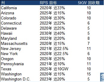Solarcity所在的其他13个州,也都同样实行了该计划,要求可在生能源所占比例在10%到40%不等,见下表。