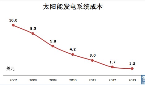 光伏投资之所以需要补贴的支持,是因为光伏系统成本过高及光伏发电效率过低所导致的,而这两颗绊脚石也在逐年的消减。由于多晶硅材料的下降,生产成本的下降和转换效率的提高,光伏系统的发电成本从2007年约10美元/W下降到目前的1.4美元/W。