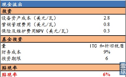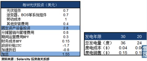 目前Solarcity的固定资产设备投资成本大约在2.8美元/瓦,加上其他的各种费用之后总投资在4美元左右。政府ITC补贴和加速折旧会抵消其中2.3美元,净投资成本在1.75美元/瓦。值得注意的是,Solarcity财务成本相对较低,主要是补贴和加速折旧迅速偿还基金的投资,一般投资年限都在6年左右。