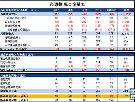 Solarcity的现金流表相对复杂,但可以将其整理并划分成新合同的投资与货币化、旧合同的收入与分成以及其他现金变动。