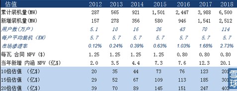 如果按照公司的规划,2018年能够做到100万户家庭规模,累计装机量达6.5GW。按照2017年以前NPV/W=$1.25的价格计算,2017年以后$0.8计算,其市值将在2016年达到150亿,在2018年达到400亿的规模,达到美国主要电力公司的规模。
