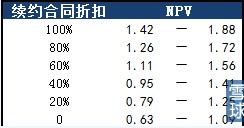 但在假设条件中,存在着续约收入、补贴基础变动以及贴现率变化的风险,所以有必要做敏感性分析。具体的风险描述,以及对NPV净值的影响,见下文。