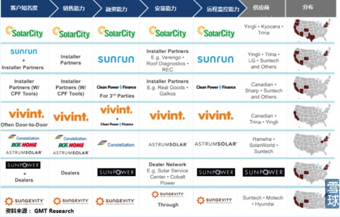 目前,Solarcity的竞争对手,要么是光伏建筑商,要么是光伏第三方金融公司,全国最大的竞争两家竞争对手Sunrun和CPF都是第三方金融公司。目前Sunrun已经成功由单一光伏金融公司向租赁运营商转型,与Solarcity不同的地方只在于Sunrun的安装部分是外包出去,拥有客户38,000。随着更多的公司采用像Solarcity的合体模式,竞争会越来越激烈。