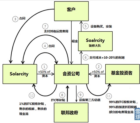 合资模式下,基金投资者和Solarcity分别出资成立合资公司,在基金投资者收回成本及收益前,基金投资者占有99%的股权,收回成本之后Solarcity占有95%的股权,并可以选择买下基金剩余的股权。