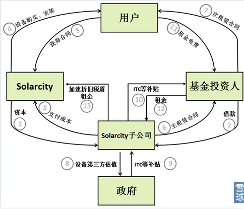 售后回租的模式最为简单,但目前基本上不采用了。它是先将设备出售给基金投资者,再将设备租回来运营的一种模式。Solarcity将设备出售后,基本上收回了全部的投资成本及利润,但需要与基金投资者的租赁合约(一般10-20年)期满后,将设备的所有权收回。