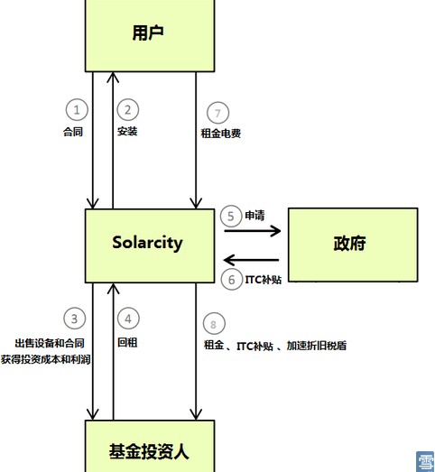 转租模式也是Solarcity常用的模式,其特点是基金不用承担设备所有权所附加的风险,一般租约期在5年,靠ITC补贴和用户租金来收回借款,而将税收的抵扣额留给了Solarcity。