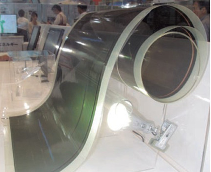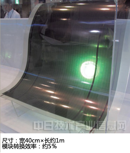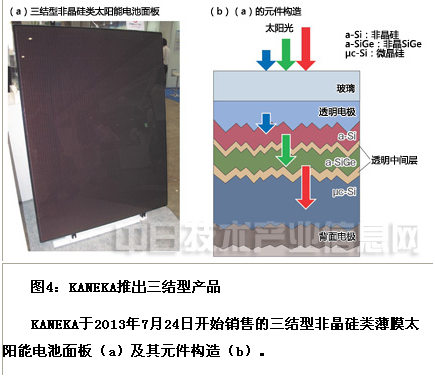 非晶硅类薄膜太阳能电池领域也出现了新开发案例。KANEKA在PVJapan2013上展示了三结型非晶硅(a-Si)类薄膜太阳能电池模块,而且在展会首日开始销售相关产品(图4)。NEDO称这是“采用a-Si、非晶SiGe(a-SiGe)和微晶硅三层构造的产品全球首次实现实用化”,“以前,夏普挑战三结型a-Si太阳能电池的开发时,第二层也是a-Si,存在层厚较厚的课题。而KANEKA此次通过把第二层的材料换成a-SiGe,使量产成为可能”。