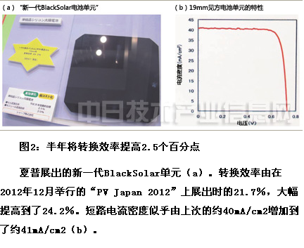 采用无机材料的各种太阳能电池也提高了特性。比如夏普正在开发的、组合异质结和背接触构造的单晶太阳能电池“新一代BlackSolar”,小尺寸电池单元的转换效率达到了24.2%(图2)。该公司在2012年12月举行的PVJapan2012上也展示了这种太阳能电池,但当时的转换效率为21.7%。仅半年左右的时间就大幅提高了2.5个百分点。夏普未公布该电池的详情,此次的短路电流密度似乎达到了约41mA/cm2,比半年前的约40mA/cm2增加了2%以上。