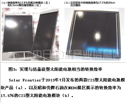 由CuInGaSSe(CIGS)类化合物构成的太阳能电池的性能也有所提高。SolarFrontier在PVJapan2013开幕前一天宣布,将于当月开始供货转换效率为13.8%的“CIS型”太阳能电池模块(图3(a))。这一转换效率在CIGS类太阳能电池产品中为世界最高水平。