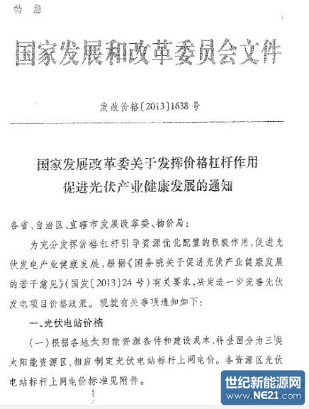 于此同时,国家发改委还公布了,《国家发改委关于发挥价格杠杆作用促进光伏产业健康发展的通知》(查看原文链接:http://www.ne21.com/news/show-45842.html),通知明确规定了大型地面光伏电站根据光伏资源条件将采取三类标杆电价,分别为0.9元/千瓦时、0.95元/千瓦时和1元/千瓦时;分布式光伏发电补贴将确定为0.42元/千瓦时。