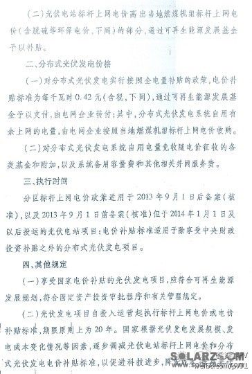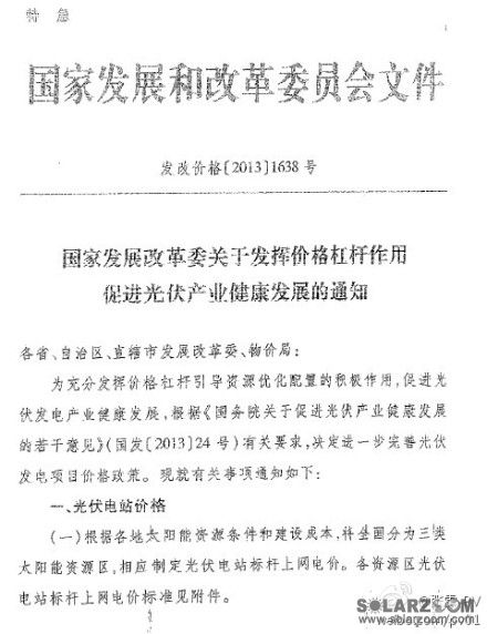 索比光伏网讯:为落实《国务院关于促进光伏产业健康发展的若干意见》(国发[2013]24号)有关要求,近日,国家发展改革委出台了《关于发挥价格杠杆作用促进光伏产业健康发展的通知》(发改价格[2013]1638号),完善了光伏发电价格政策。