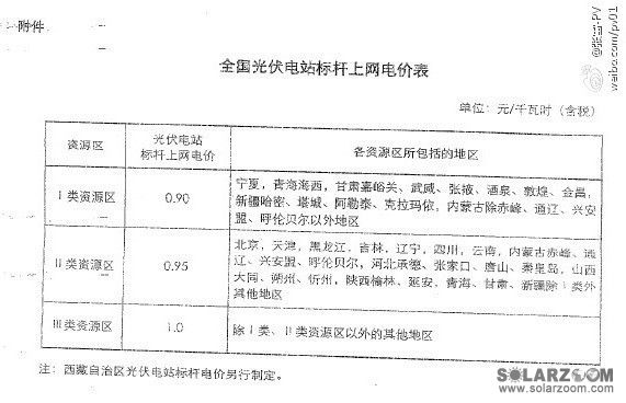 通知明确,对光伏电站实行分区域的标杆上网电价政策。根据各地太阳能资源条件和建设成本,将全国分为三类资源区,分别执行每千瓦时0.9元、0.95元、1元的电价标准。对分布式光伏发电项目,实行按照发电量进行电价补贴的政策,电价补贴标准为每千瓦时0.42元。
