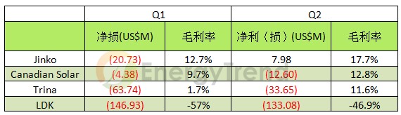 已公布2Q13财报中国太阳能厂商净利(损)及毛利润比较:
