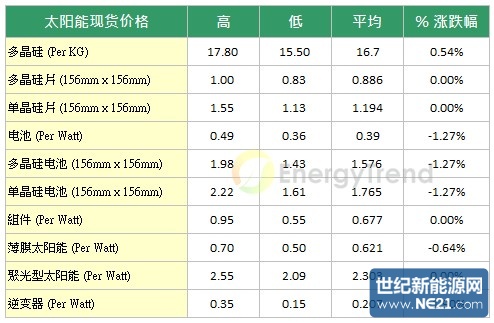 就现货市场整体表现来看,大陆多晶硅市场价格仍在RMB135/kg至RMB140/kg的高档,使得多晶硅价格走势不变,平均价格来到US$16.70/kg,涨幅0.54%。在硅片市场方面,目前买卖双方仍针对价格进行协商,本周价格维持不变。在电池报价方面,目前价格持续下滑,部分业者勉强守住US$0.39/watt,但其余议价能力较弱的业者,其报价已往US$0.38/watt的底限迈进,使得本周平均价格下滑1.27%,来到US$0.39/watt;而在组件方面,本周价格持平。而在基本面不佳,加上面临其它技术的挑战,本周硅薄膜产品的价格再次下滑到US$0.621/watt,跌幅0.64%;同样面临价格的压力,逆变器平均价格下滑1.9%,本周平均价位来到US$0.207/watt。