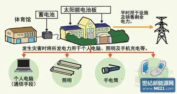 平时会将所发电力用于学校设施,或进行蓄电,同时销售剩余电力。发生灾害时,会将所蓄积的电力供应给个人电脑及照明装置,或者用于手机充电等用途。另外,采用的系统还可在因灾害而停电时,利用蓄电池电力,自动重新启动太阳能发电系统等。