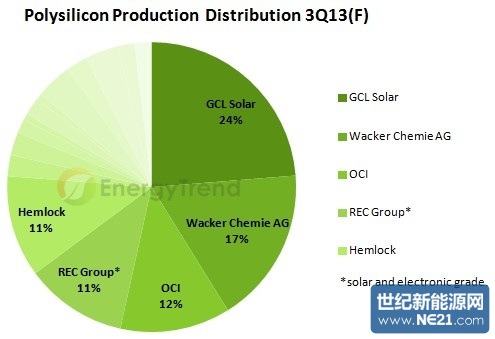 EnergyTrend表示,由于市场不确定因素仍多,多数多晶矽业者近期暂停产能扩充计划,仅少数业者如Tokuyama仍按计划完成产能扩建,其马来西亚厂第一阶段6,200吨产能多数将以半导体产品为主,仅少量供给太阳能业者使用;全球前五大业者(GCL, OCI, Wacker, REC, Hemlock不按排名)上半年出货占全球75%以上,展望第三季仍将维持此一状况(见图)。