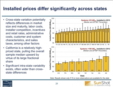 据劳伦斯伯克利国家实验室(LawrenceBerkeleyNationalLaboratory,LBNL)最近的一份名为《跟踪太阳》(TrackingtheSun)的报告显示,加州市场上小型系统的安装成本为US$5.7/W,与南卡罗来纳州并列成为价格第四昂贵的州。同时,德州令人惊奇地以$3.9/w的成本排在表单末尾。