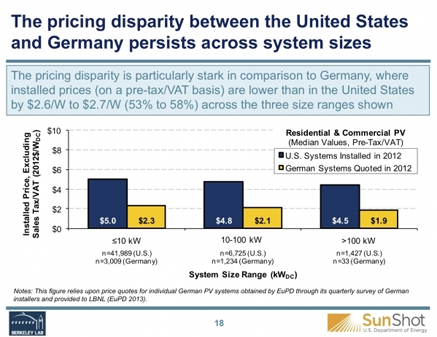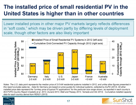 美国国家可再生能源实验室的高级金融分析师大卫˙菲尔德曼(DavidFeldman)表示:“消费者会花费比其他地方都昂贵得多的费用来安装系统,这背后有着许多原因,不管是由于高点价而导致的相关安装商费用,还是进入某一特定市场所遇到的阻碍而导致的竞争活力底下的状况等。”