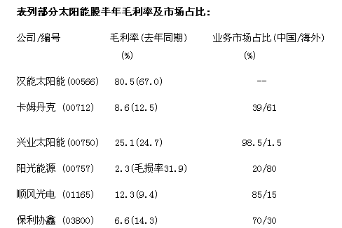 至于兴业太阳能(00750)方面,其近年逐步将发展重点由毛利率较低的传统幕墙业务(毛利率16.4%),转移到毛利率较高的光伏建筑一体化项目(毛利率31.5%),当中又较集团于盈利更高的工商楼宇工程。截至今年6月底止半年,集团光伏建筑一体化工程的收入占比已由去年同期的39.5%增至至48.1%。集团表示行业竞争加剧,定价有压力,不过预期光伏建筑一体化项目利润可保持于较高水平。