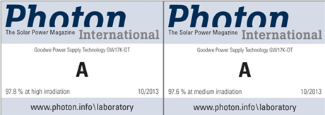 索比光伏网讯:江苏固德威今日宣布,公司17千瓦三相双路光伏逆变器(GW17K-DT)在PHOTON实验室一系列严苛测试中表现优异,获其双“A”评级。固德威也因此成为第一家在一年间隔时间内连续两次获得PHOTON双A评级的中国逆变器厂商。