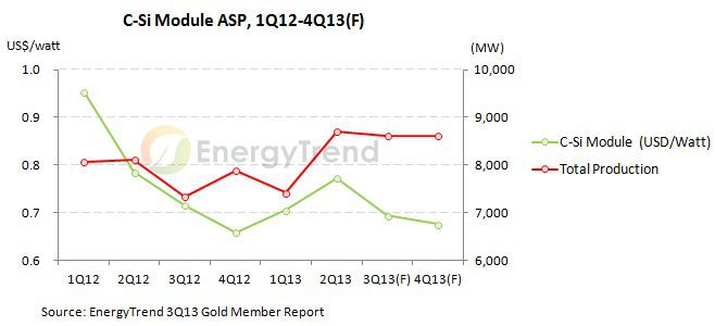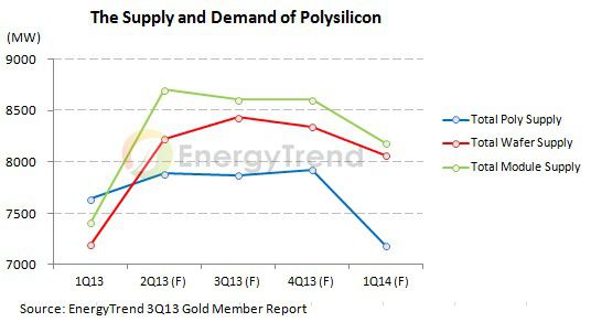全球太阳能产业过去几年供过于求的状况,导致多晶硅价格一路下滑,多数新进业者不堪持续亏损,自2H12起陆续暂停产线的运作,使得全球多晶硅的有效产能持续缩减至目前供需相对宽松的局面。2014年市场有可能出现明显回温,但多晶硅产线复工需要一季左右的时间,EnegyTrend认为明年第一季多晶硅的供需状况将吃紧、甚至供不应求。