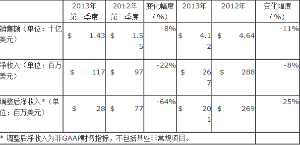 索比光伏网讯:道康宁今日公布了2013年第三季度的业绩报告。公司第三季度销售额为41.2亿美元,净收入为2.67亿美元。销售额和调整后的净收入相较于2012年同期分别下降了11%和25%。2013年和2012年调整后的净收入剔除了长期销售协议所带来的收益。此外,2013调整后的净收入剔除了重组费用、受损资产及利好的衍生品合约收益。